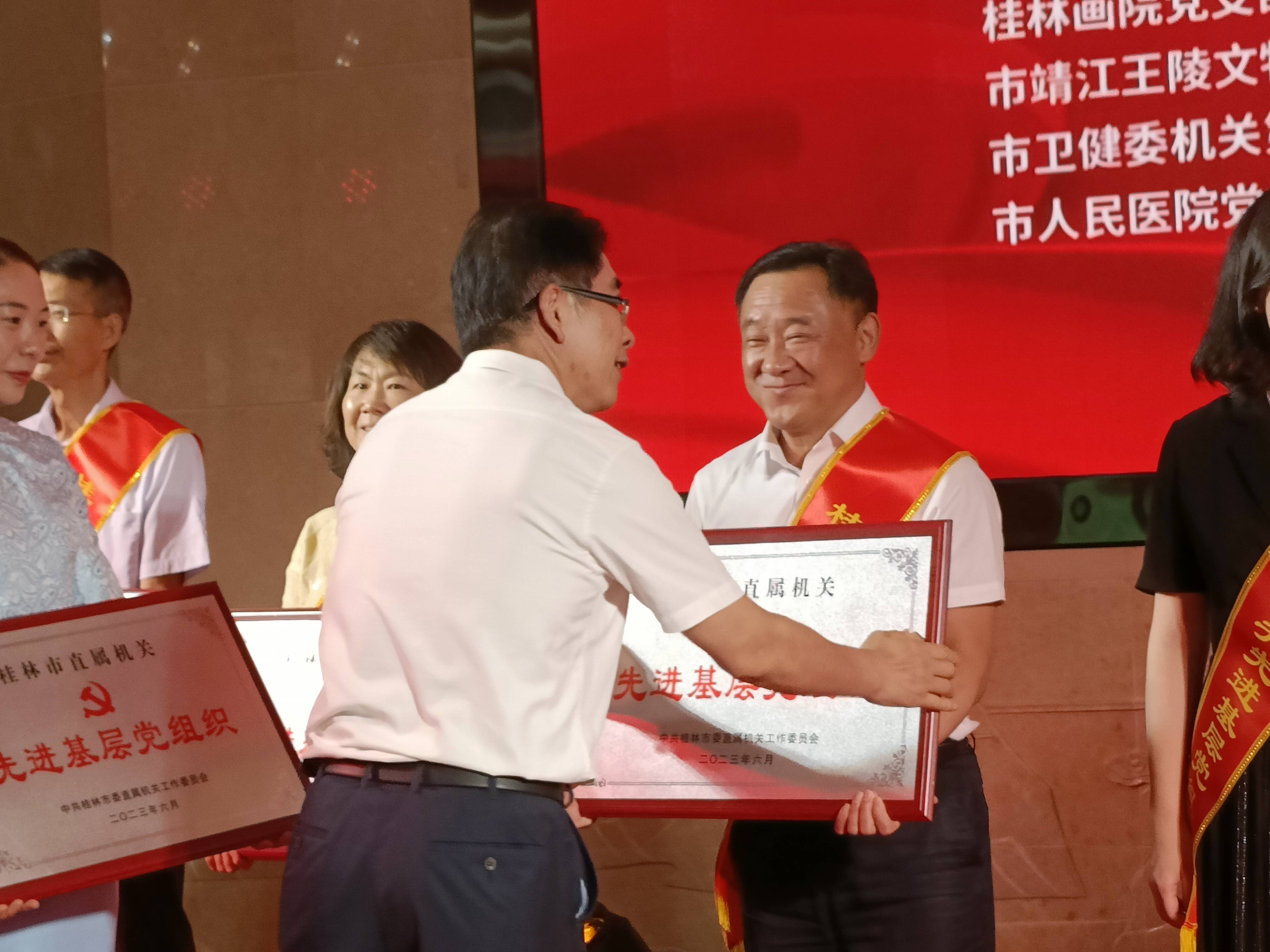 6月30日下午,我市举行桂林市直属机关“两优一先”表彰暨市党群服务中心升级改造竣工仪式,对市直机关优秀党员、优秀党务工作者和先进基层党组织进行表彰,为老党员颁发“光荣在党50年”纪念章,并组织预备党员宣誓和党员重温入党誓词活动。中心党组书记、党总支书记李钧代表中心党总支上台领取“先进基层党组织”荣誉奖牌。