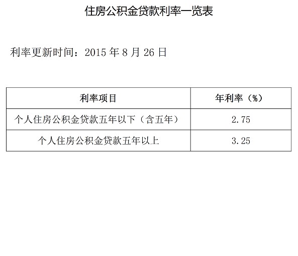 2015年8月26日住房公积金贷款利率一览表
