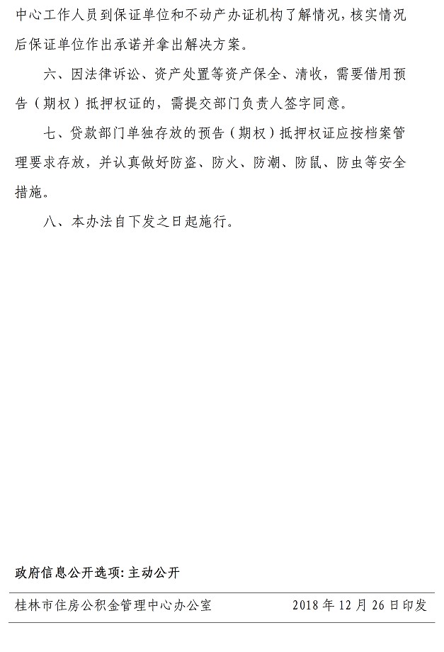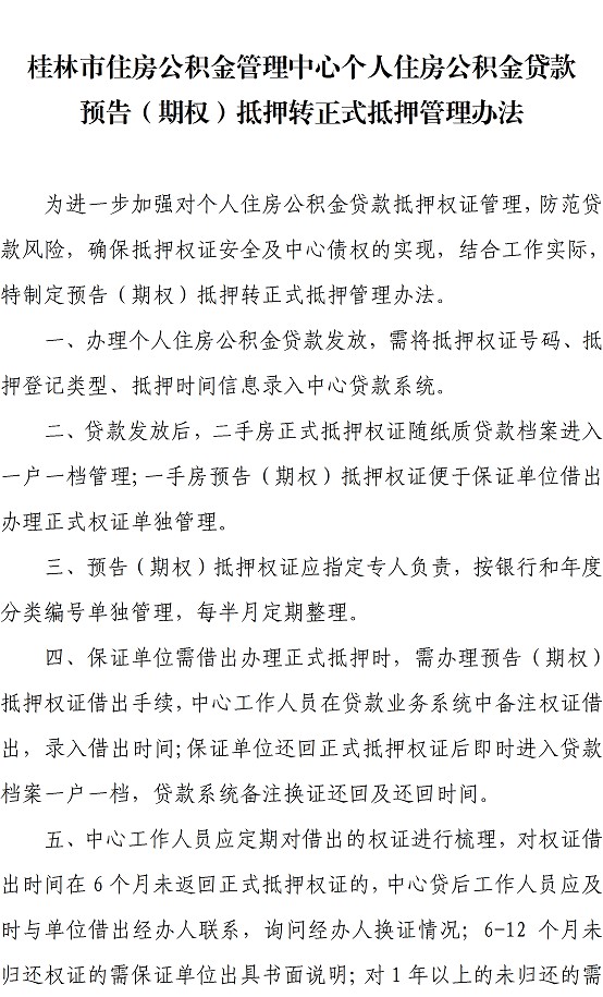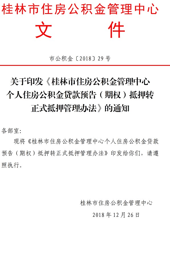 关于印发《桂林市住房公积金管理中心个人住房公积金贷款预告(期权)抵押转正式抵押管理办法》的通知(市公积金〔2018〕29号)