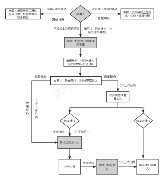 两地联办:(该项业务主要适用于“跨省通办”专窗受理本地购房异地缴存职工的购房提取住房公积金业务):“跨省通办”专窗接收异地缴存职工的申请,对职工身份进行审查,并在职工授权情况下对职工购房信息进行核实,核实通过的,将职工申请材料传递至缴存地中心,缴存地中心完成业务办理,受理地中心负责向职工反馈。