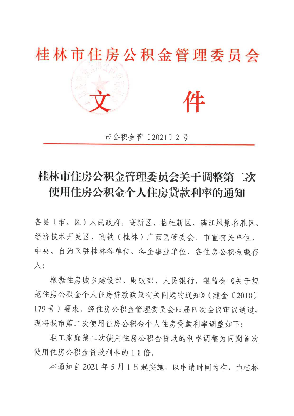 桂林市住房公积金管理委员会关于调整第二次使用住房公积金个人住房贷款利率的通知(市公积金管〔2021〕2号)