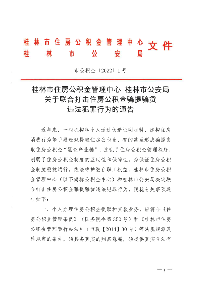 桂林市住房公积金管理中心 桂林市公安局 关于联合打击住房公积金骗提骗贷违法犯罪行为的通告(市公积金〔2022〕1号)