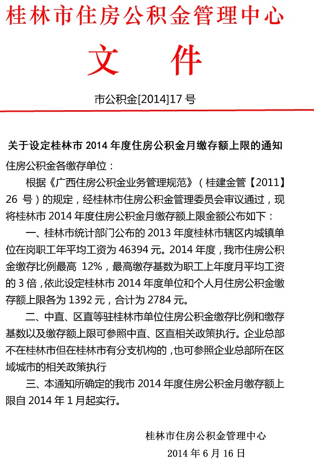 关于设定桂林市2014年度住房公积金月缴存额上限的通知