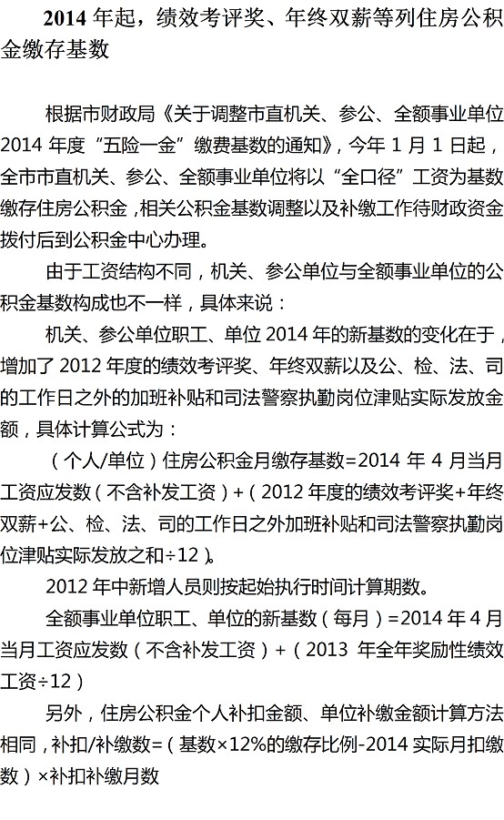 2014年起,绩效考评奖、年终双薪等列住房公积金缴存基数
