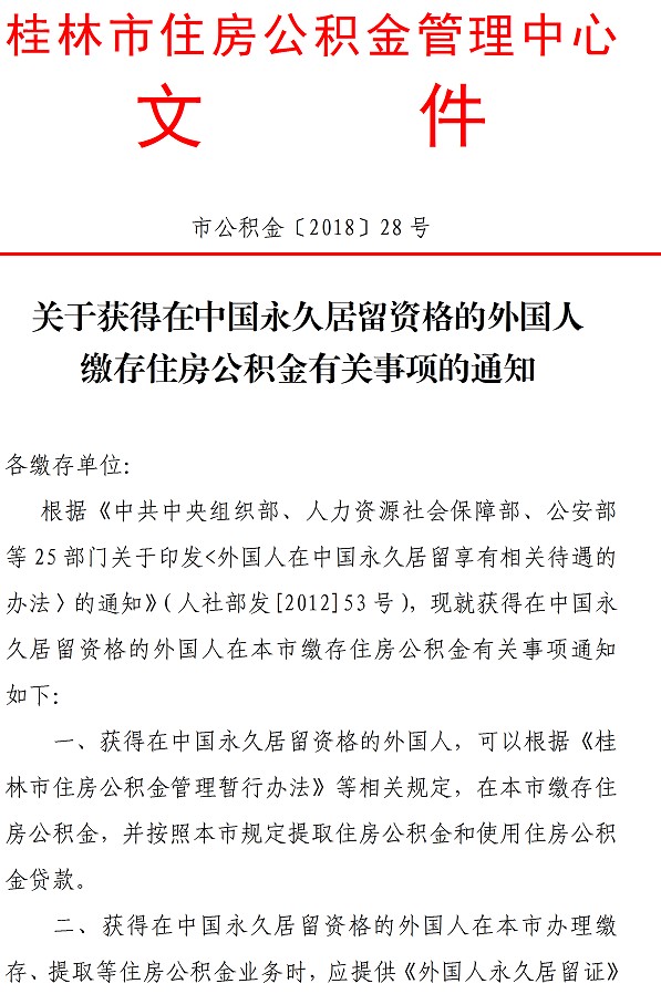 关于获得在中国永久居留资格的外国人缴存住房公积金有关事项的通知(市公积金〔2018〕28号)
