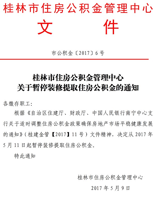 桂林市住房公积金管理中心关于暂停装修提取住房公积金的通知(市公积金〔2017〕6号)
