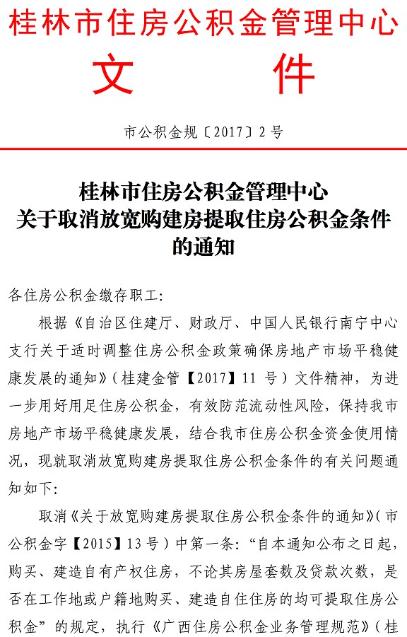 桂林市住房公积金管理中心关于取消放宽购建房提取住房公积金条件的通知(市公积金规〔2017〕2号)