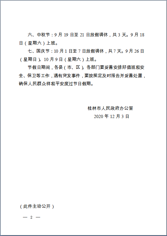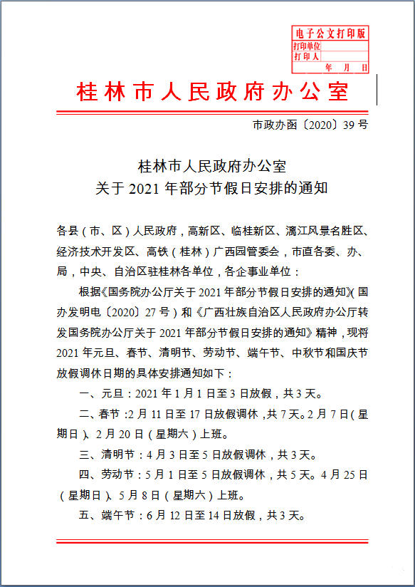 桂林市人民政府办公室关于2021年部分节假日安排的通知(市政办函〔2020〕39号)
