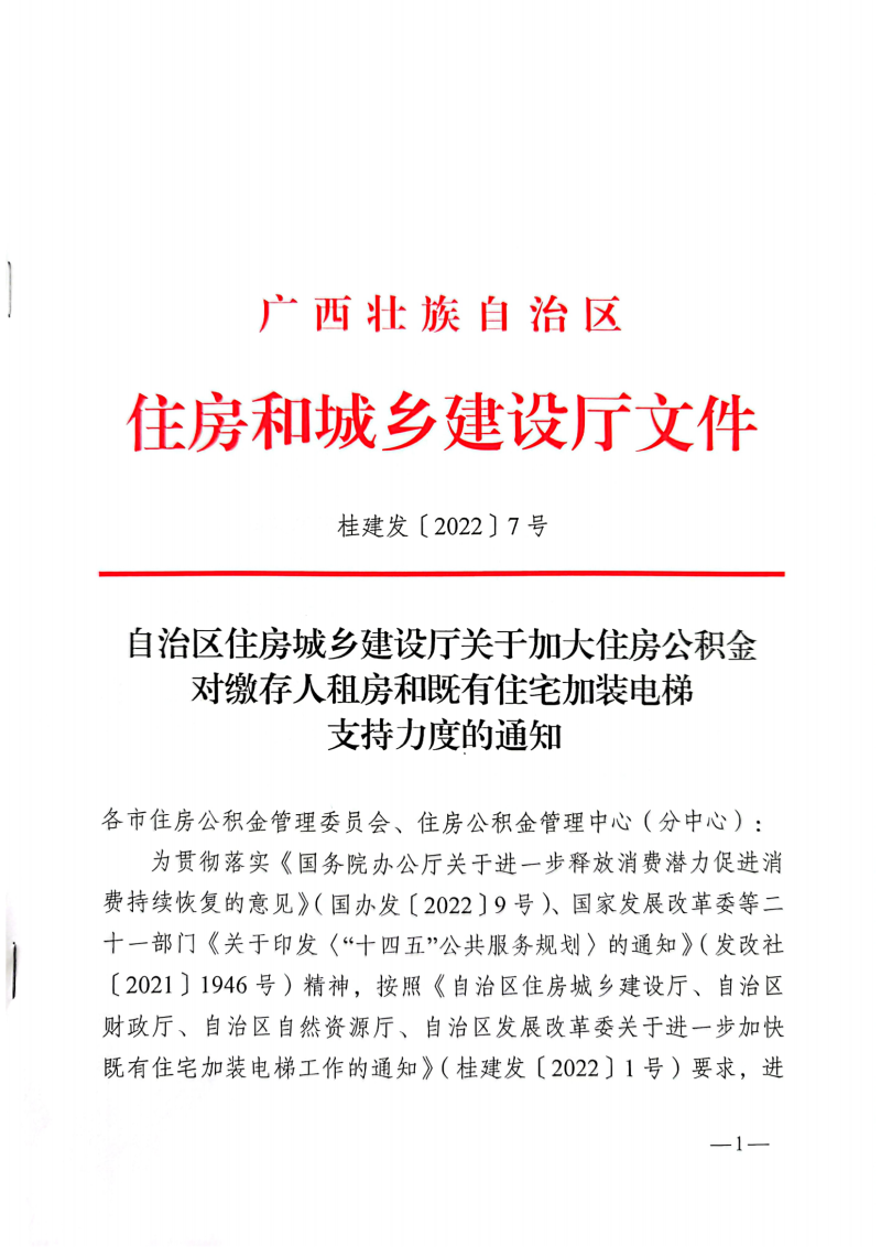 自治区住房城乡建设厅关于加大住房公积金对缴存人租房和既有住宅加装电梯支持力度的通知(桂建发〔2022〕7号)