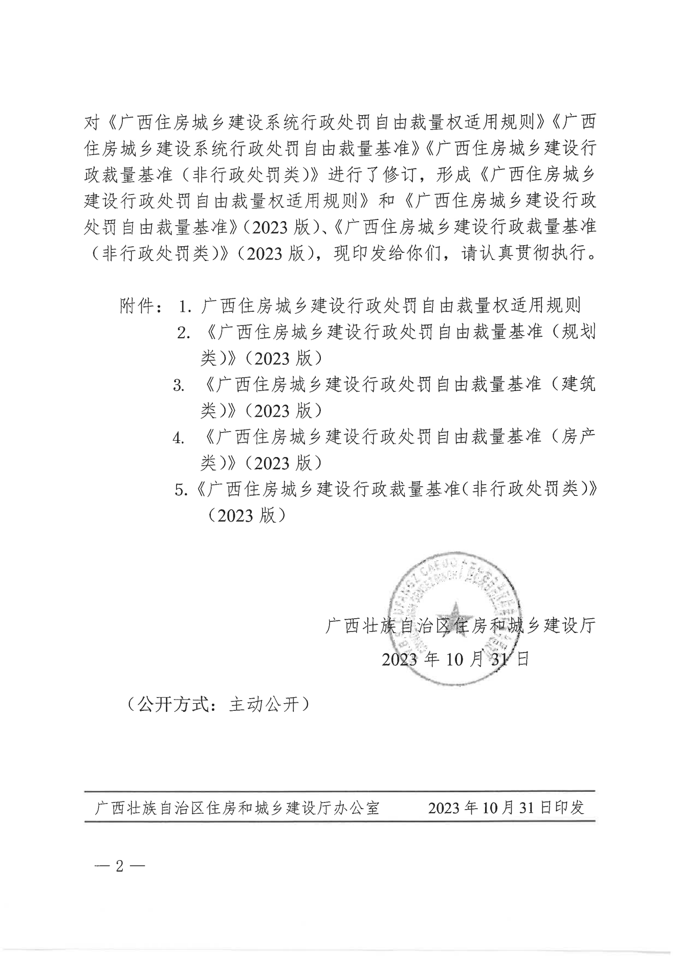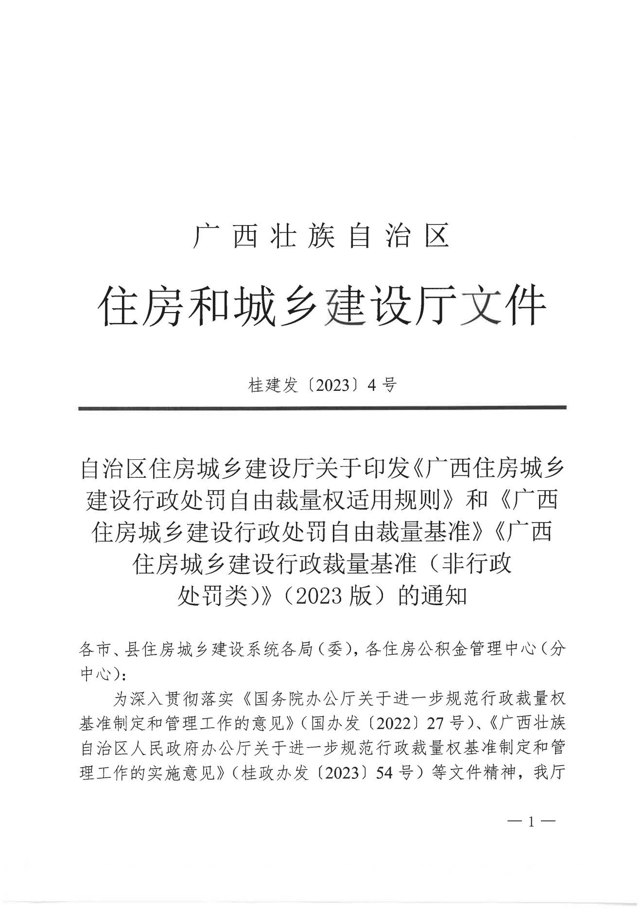 自治区住房城乡建设厅关于印发《广西住房城乡建设行政处罚自由裁量权适用规则》和《广西住房城乡建设行政处罚自由裁量基准》《广西住房城乡建设行政裁量基准(非行政处罚类)》(2023版)的通知(桂建发〔2023〕4号)