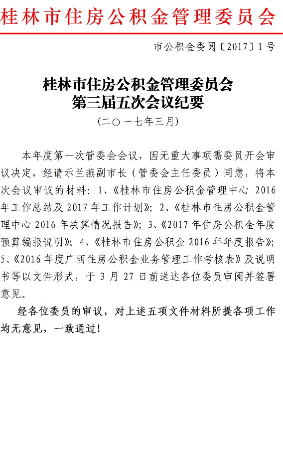 桂林市住房公积金管理委员会第三届五次会议纪要(市公积金委阅〔2017〕1号)