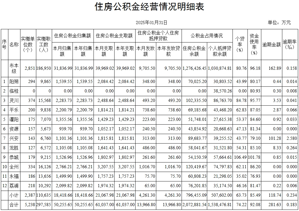 2025年1月住房公积金经营情况明细表