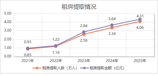 落实“租购并举”政策,优化租房提取规则,2025年,租房提取人数4.06万人,同比增长21.66%;租房提取金额3.64亿元,同比增长18.47%。