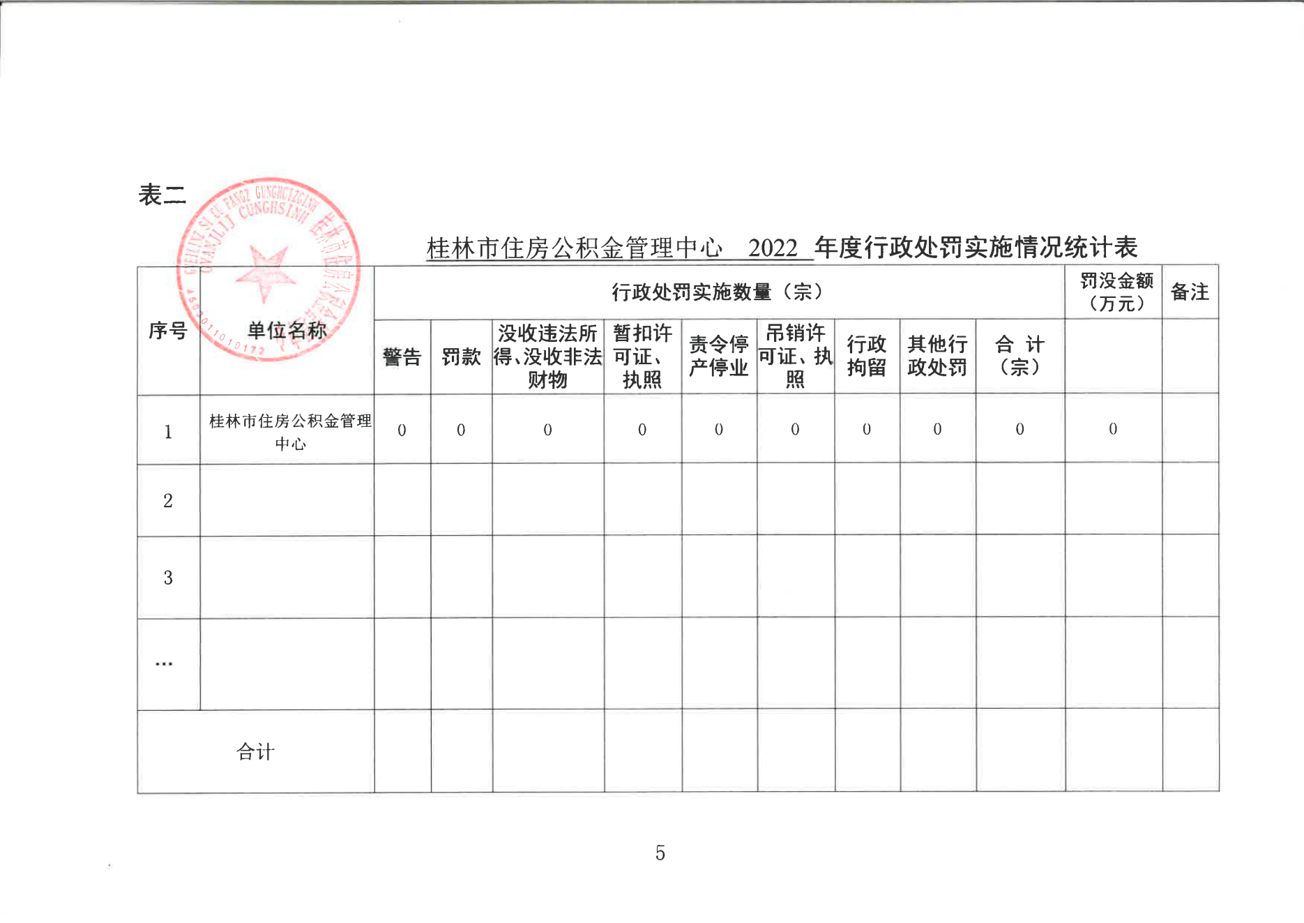 桂林市住房公积金管理中心2022年度行政处罚实施情况统计表