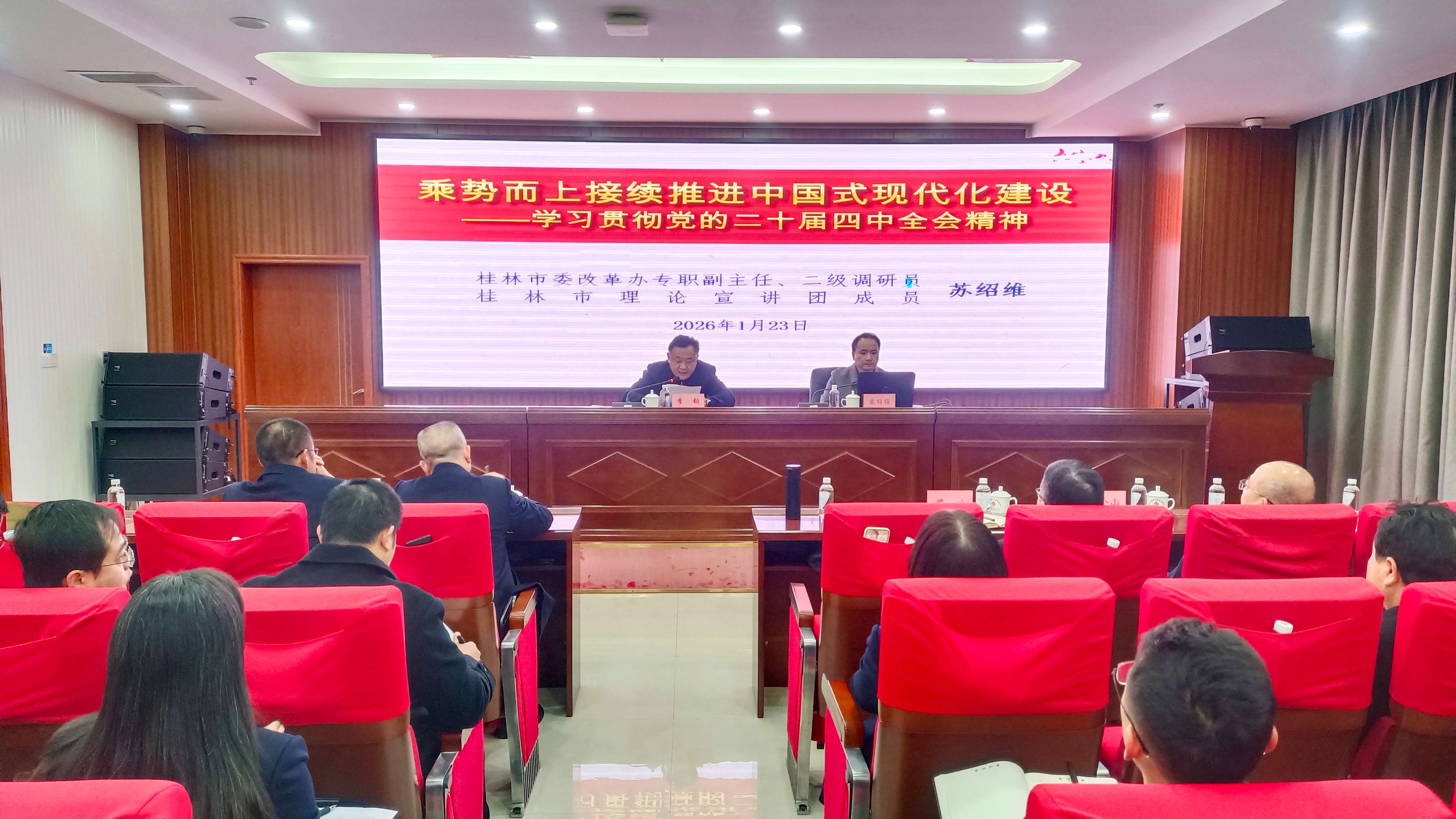为深入贯彻落实党的二十届四中全会精神,切实把广大党员干部思想和行动统一到全会精神上来,1月23日上午,桂林市住房公积金管理中心组织召开党的二十届四中全会精神宣讲会,中心党组书记、主任李钧主持会议并作总结讲话,会议邀请市理论宣讲团成员、市委改革办专职副主任、二级调研员苏绍维同志作专题辅导,中心50多名党员干部参加学习。