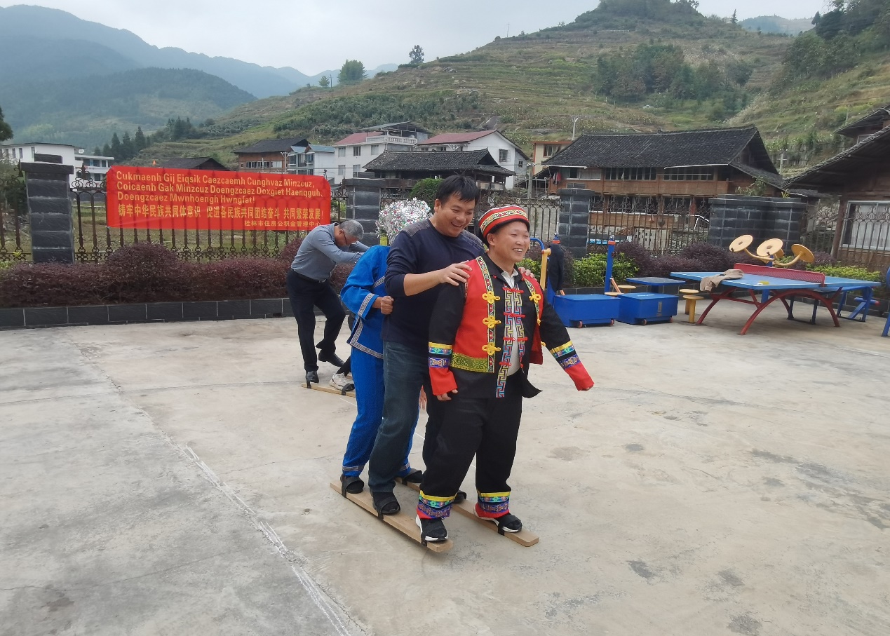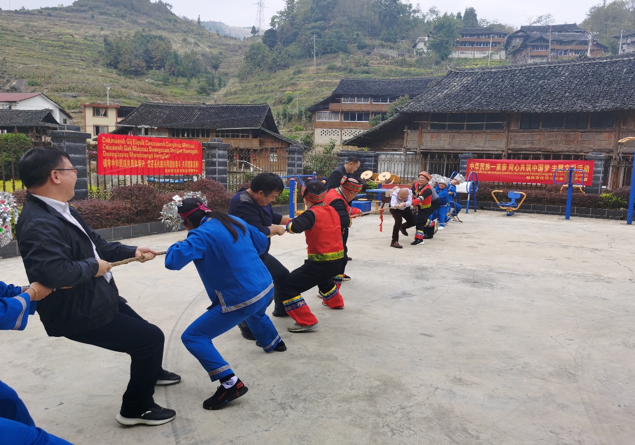 金秋十月的阳光播撒在静谧的苗寨里,沿着弯曲的寨道,李钧主任带队一行为里木村6户脱贫监测户带去党和政府的关怀和慰问。走入寨民家、话家常、送祝福,关切地询问其日常生活、身体状况,为他们送去米油粮食等生活必需品,拉近与少数民族群众之间的距离,促进各族同胞之间的交往交流交融。慰问活动结束之后,在里木村活动中心举行一场以“中华民族一家亲,同心共筑中国梦”民族团结主题的文娱活动。中心职工与寨民一同,在激烈、欢快的竞技赛场上,开展具有少数特色的拔河、板鞋等趣味竞赛活动。在竞赛中,传递出民族融合的和谐风气,画出了全民同心圆,加强了民族文化交流,增进了民族之间的情谊。