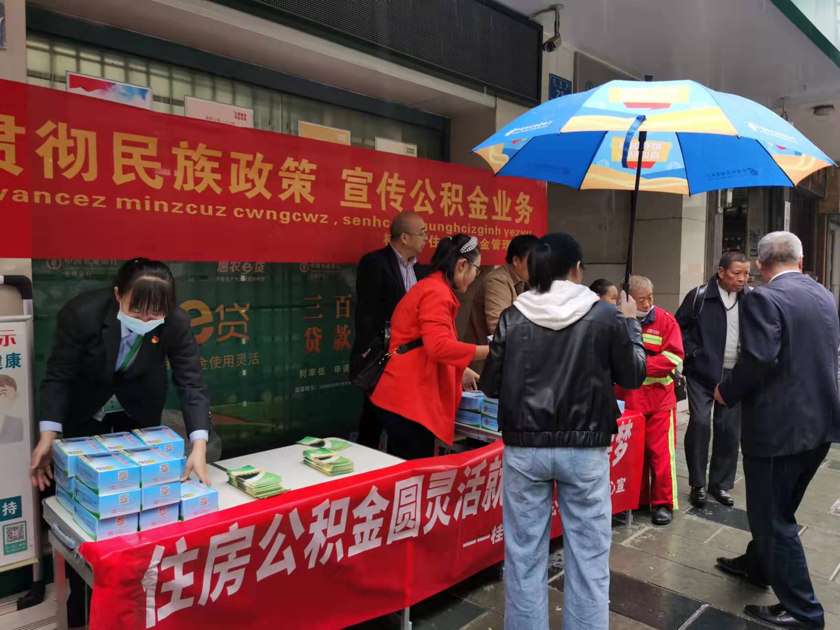 围绕“贯彻民族政策,宣传公积金业务”为主题,桂林市住房公积金管理中心在龙胜各族自治县城,立柜设点,向当地群众派发宣传单,宣传灵活就业人员自愿缴存业务及民族理论政策等相关知识,耐心的接受群众的业务咨询,详细的解答疑难问题。活动的开展进一步扩大了群众对民族团结进步创建工作的知晓率,提高群众自觉维护民族团结的意识。在一问一答的互动中,拉近与各族群众之间的距离,营造出和谐、友爱的良好民族团结氛围。