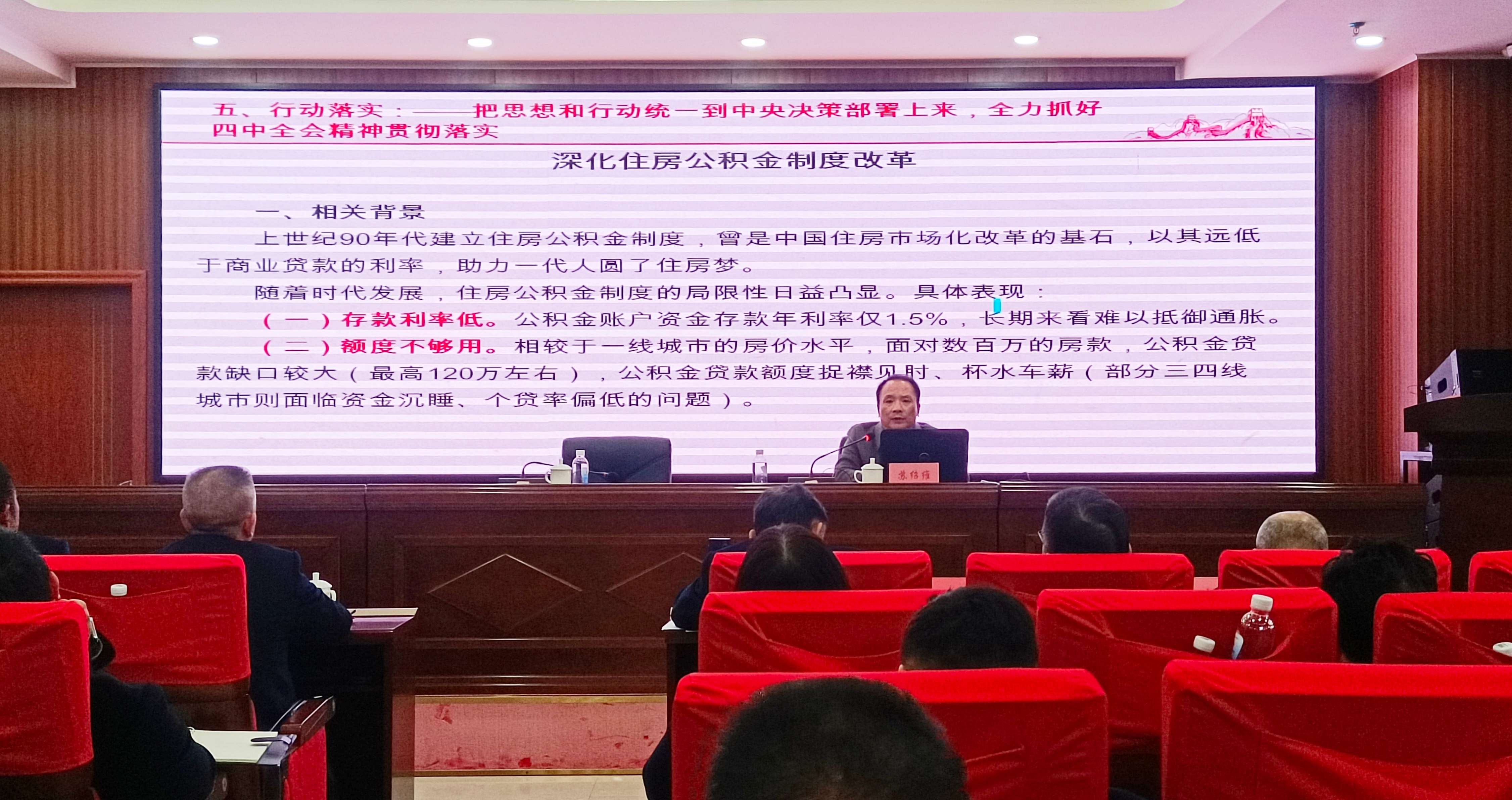 宣讲报告从党的二十届四中全会的重大意义,“十五五”时期的发展指引、发展部署、根本保证,以及贯彻落实四中全会精神五个方面进行了系统阐释和深刻解读,使大家更加清醒地认识到新发展阶段所肩负的时代使命与战略机遇。报告从党和国家事业发展全局的高度,深刻阐述了坚持和完善中国特色社会主义制度、推进国家治理体系和治理能力现代化的重大战略部署。报告紧扣全会《决定》和重要讲话精神,对坚持和加强党的全面领导、坚持以人民为中心的发展思想、落实战略部署等方面核心内容进行了详细的讲解。报告不仅系统传达了全会精神,还结合学习贯彻中央经济工作会议精神,对深化住房公积金制度改革政策取向进行解读分析,并就落实有关改革工作提出了宝贵建议,对如何更好发挥住房公积金的住房保障功能、优化服务供给、防范化解风险等方面具有很强的参考价值和指导意义。